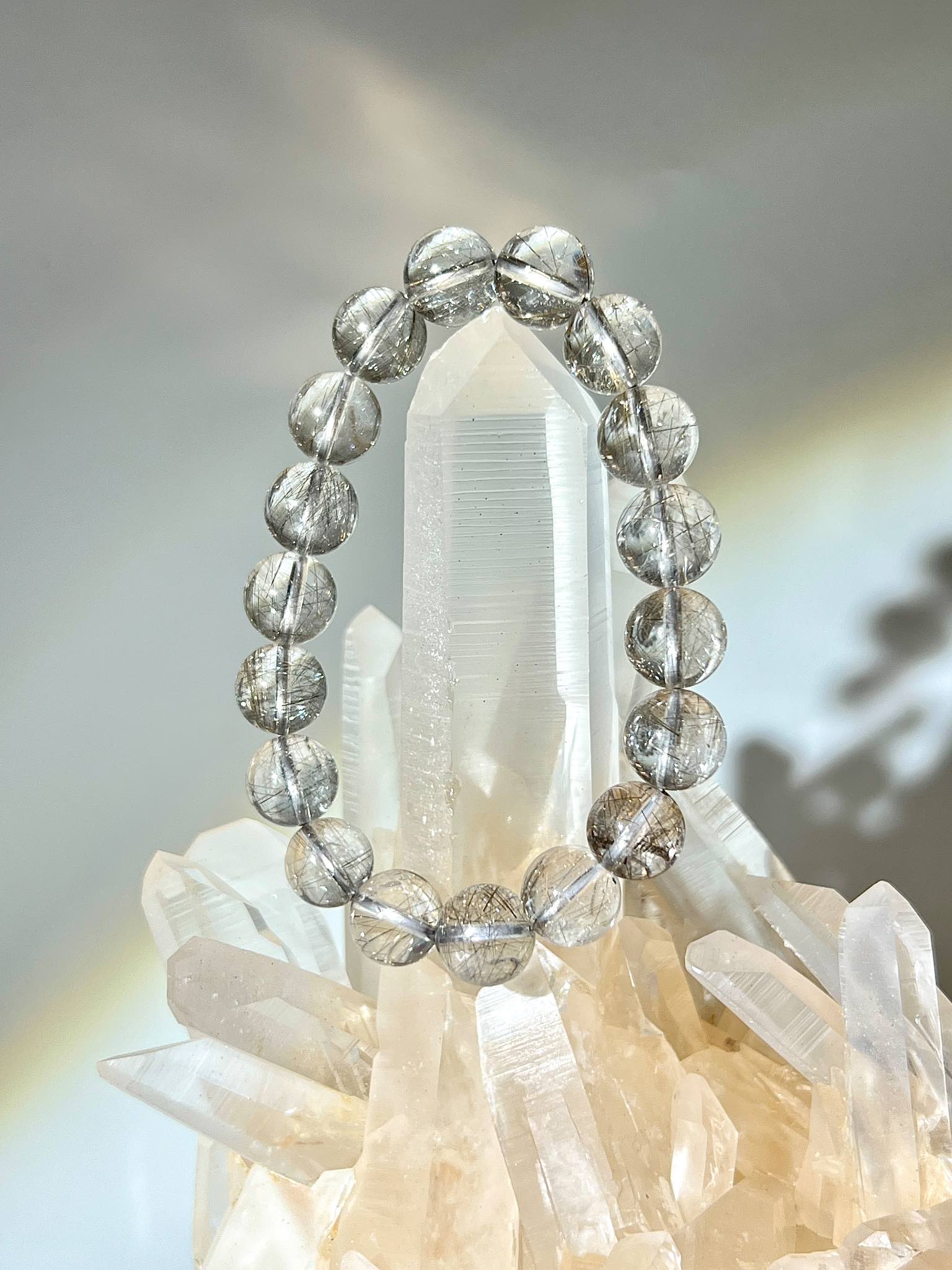此手串融合了兩種高頻髮晶能量:銀髮晶對應頂輪,連結宇宙智慧與靈感;魔鬼髮晶對應臍輪,強化行動力與現實顯化。兩者以通透玻璃體為基底,象徵著「從靈感下載到落地實現」的完整通道,適合追求精神成長同時需要務實成就的佩戴者。」
