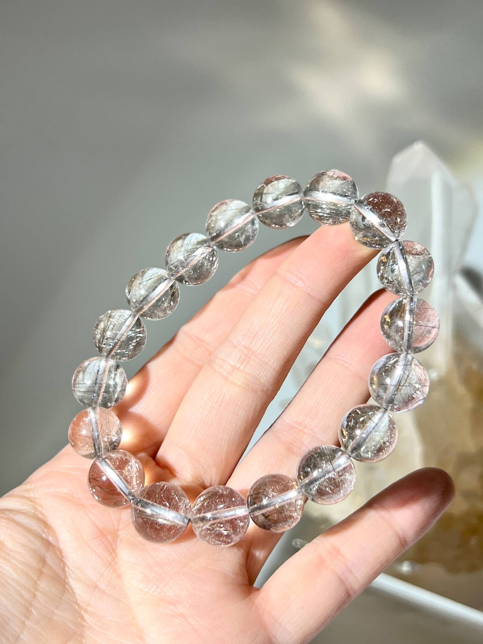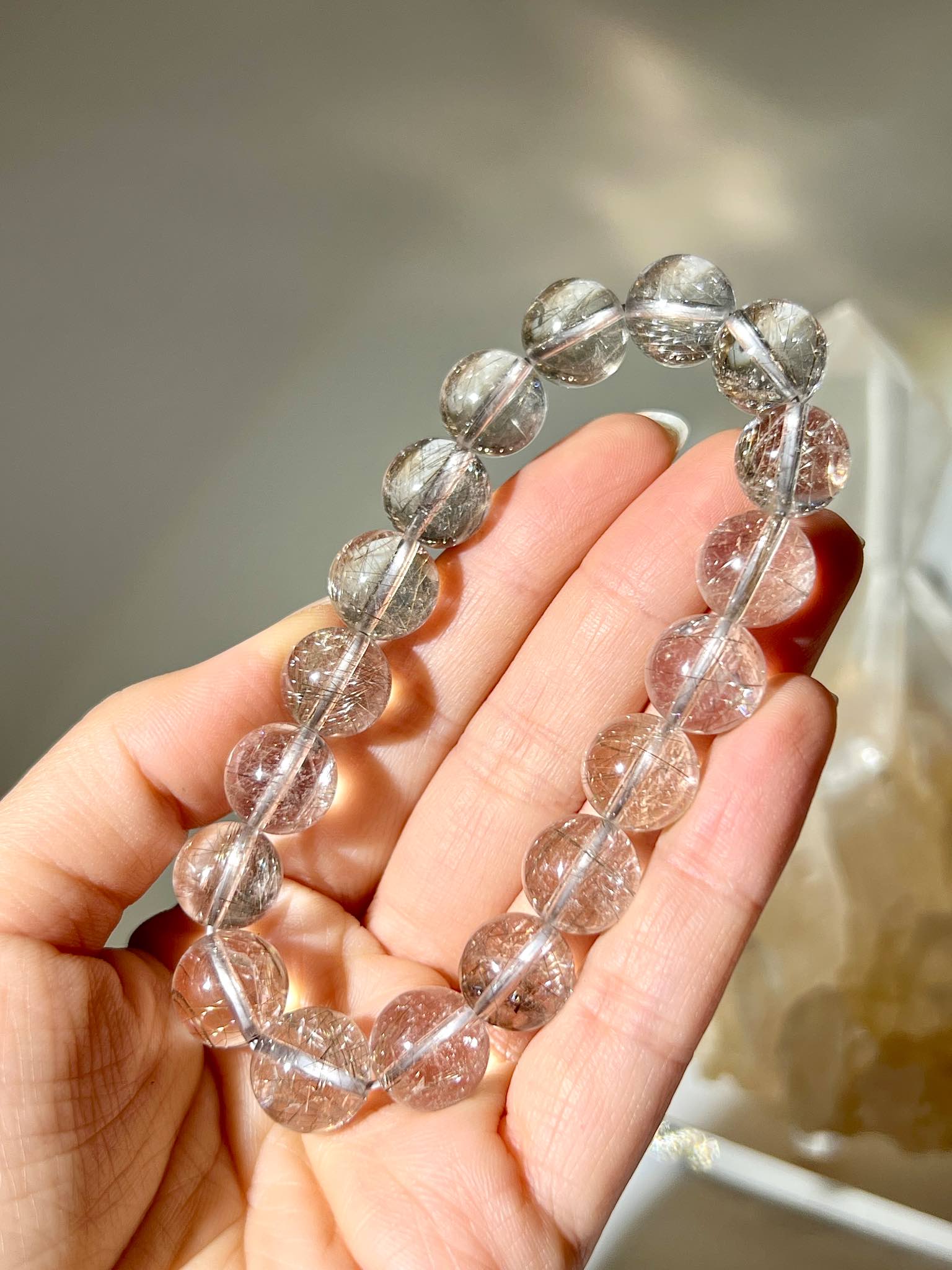 店主推薦:「這條手串以全通透如玻璃體的白水晶為基底,晶體清澈無瑕。內部包裹著閃爍的銀白色髮絲,並點綴著溫和的香檳金色魔鬼髮晶,整體光感純淨而高頻,是兼具高頻靈性與落地力量的稀有組合。