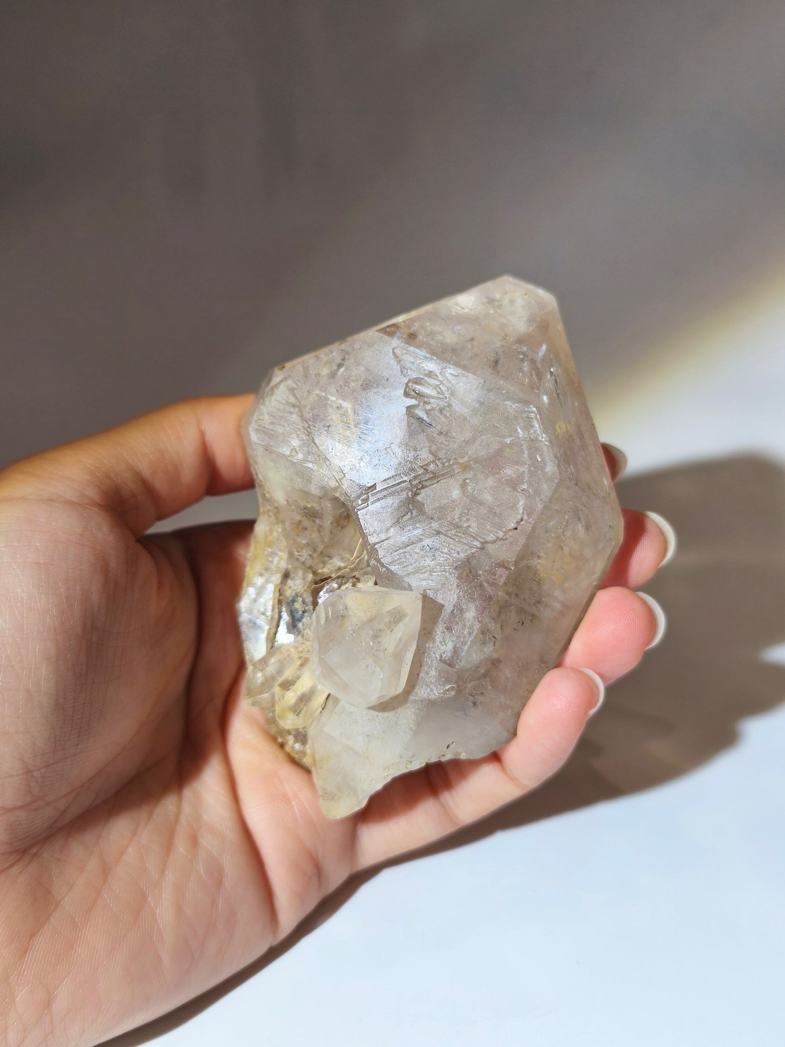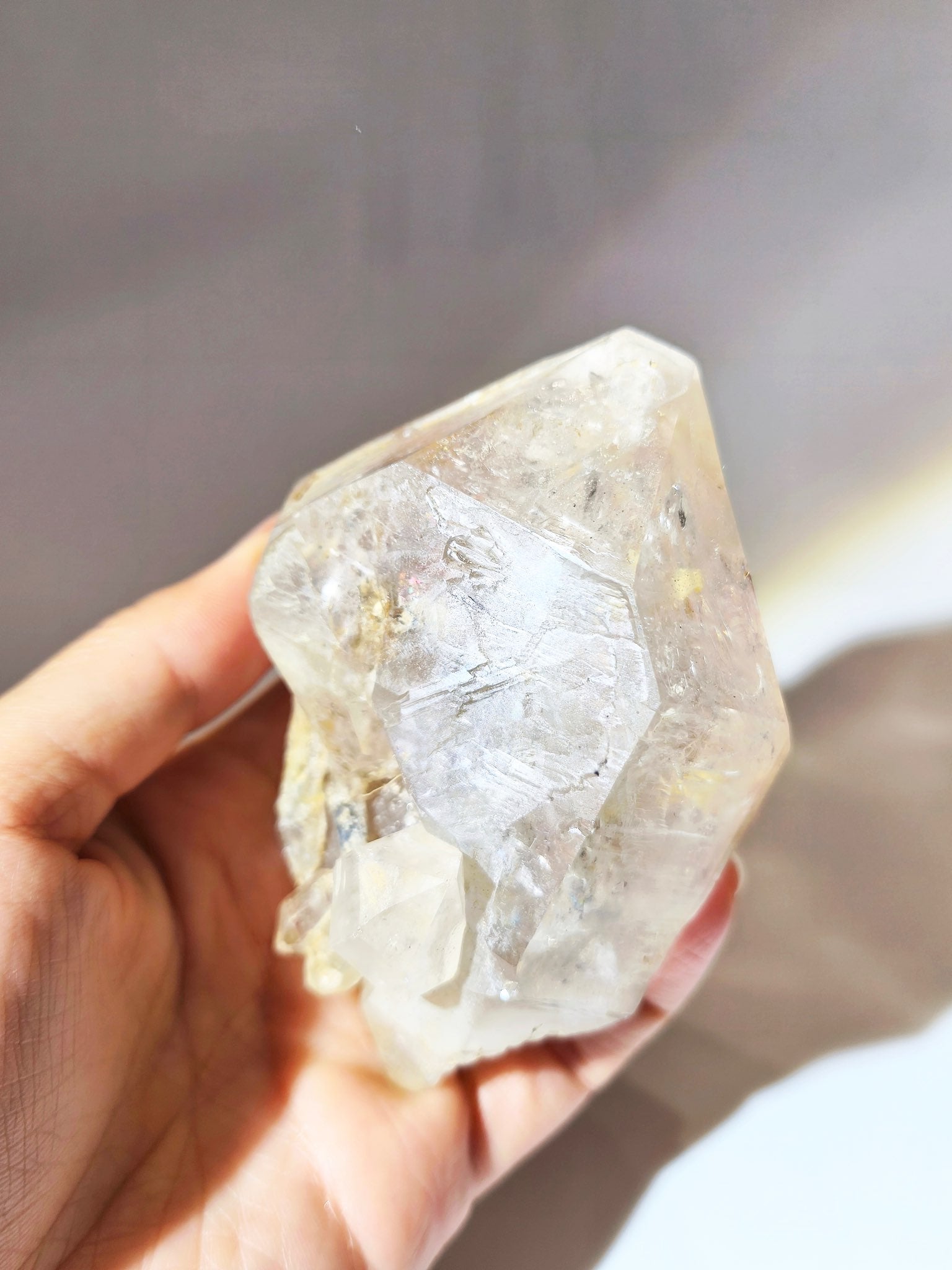 「這款金黃色的閃靈鑽,結合了『Golden Healer』的強力療癒頻率與『涅槃水晶』的深刻轉化特質。它歷經自然溶蝕,二次生長、還有共生水晶。擁有獨特的療癒頻率。內部的多空管結構更讓能量得以高速流通。對於尋求深層內在轉化與能量修復的人來說,它是一位強大的靈性導師。」