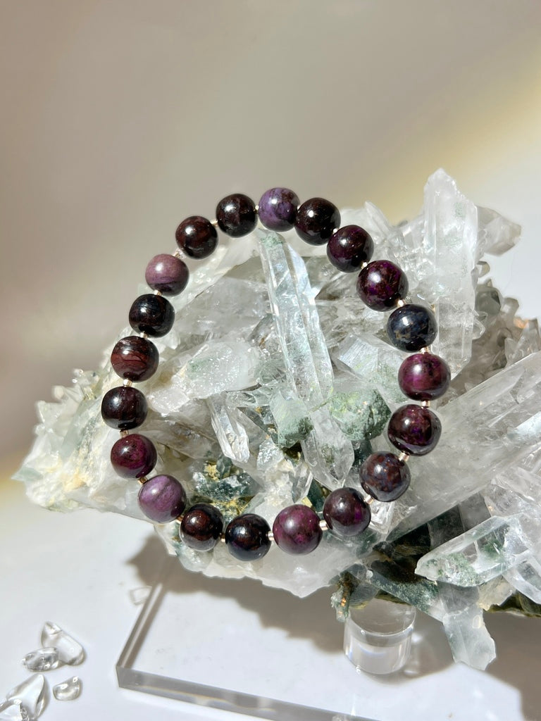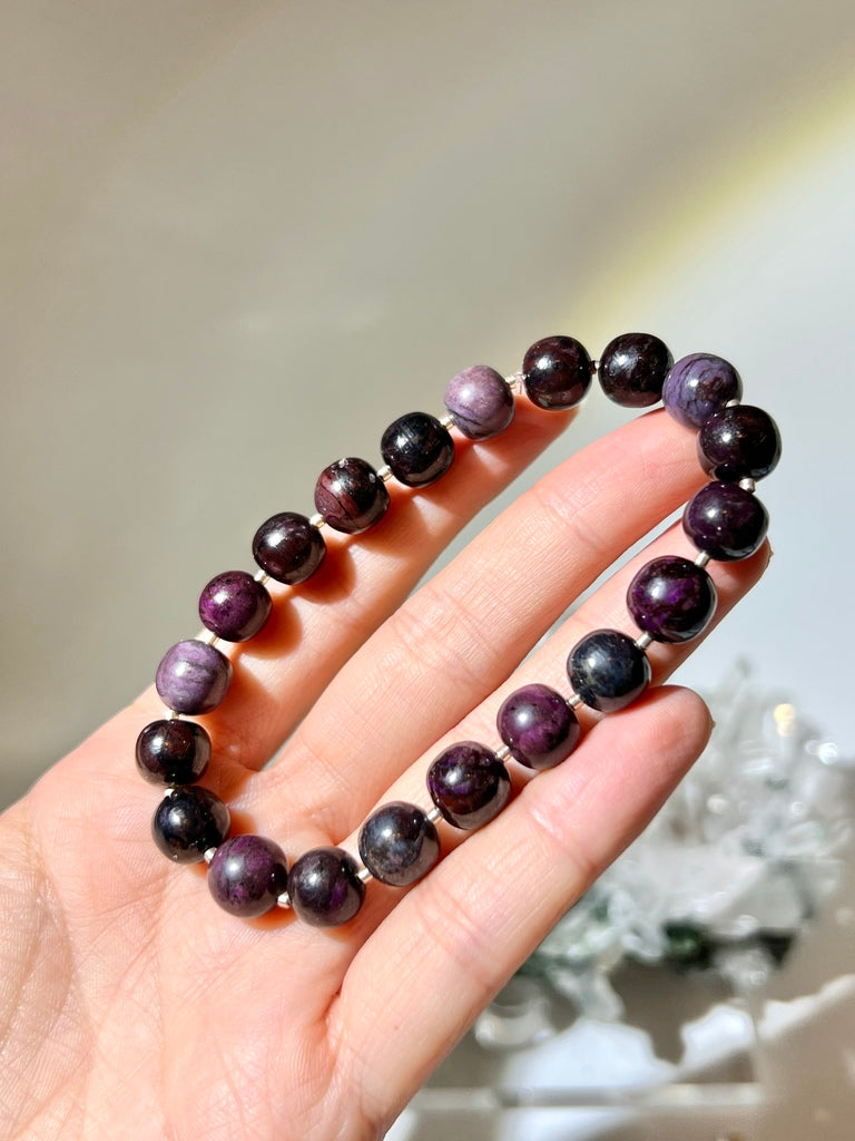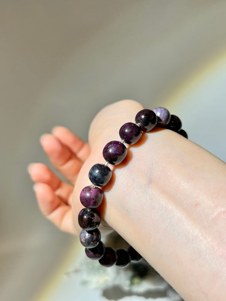 "舒俱徠有眾多紫色調,此手串的紫偏鮮紫粉,在戶光燈光下由神秘感重的舒俱徠變成鮮艷紫色!非常好看!鐵質礦皮含量少,每一顆充滿紫色,而且在拍攝下仍能捕捉到與實物幾乎一樣的色彩!"